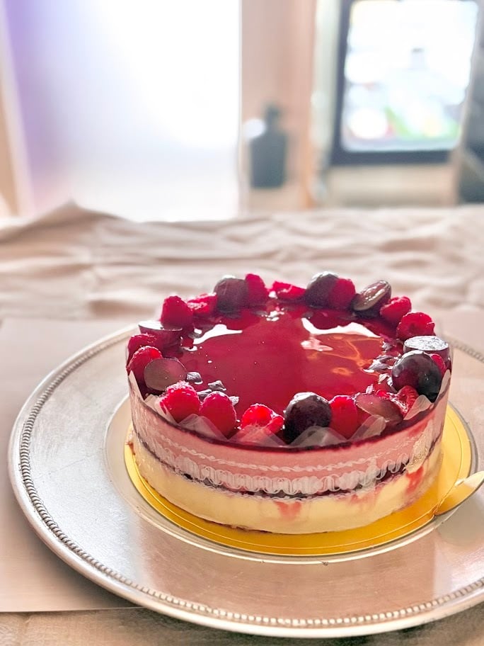 バニラのムースとベリーのムース2つのムースの真ん中にベリーのゼリーを忍ばせた華やかなケーキです。